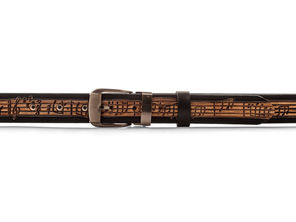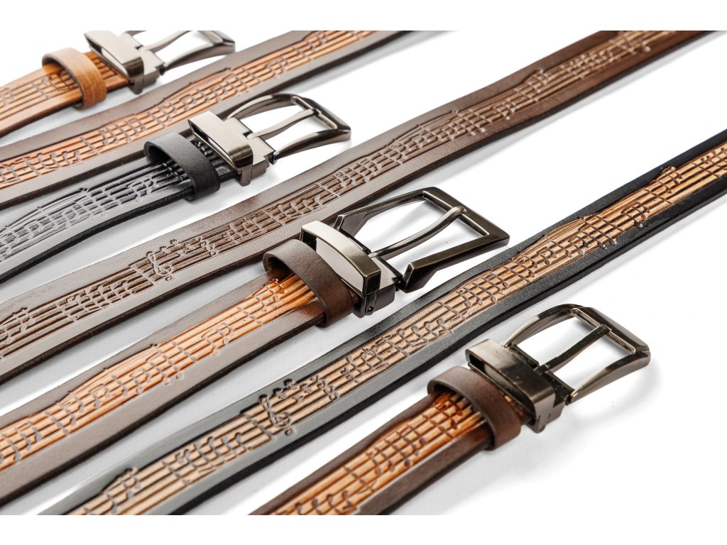 Pásek je z hladké hovězí kůže, délku lze snadno upravit – sponu lze sundat a pásek zkrátit přesně podle vašich potřeb. Vyražená partitura na pásku zvýrazňuje hudební motiv a dodává originální vzhled. Černý základ s jemně kontrastními tóny partitury vytváří univerzální doplněk vhodný k formálním i volnočasovým outfitům.