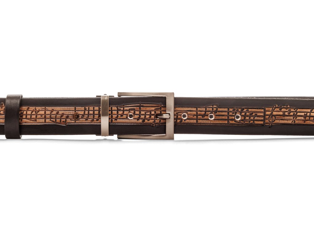 Tento stylový pásek z kvalitní hlazené hovězí kůže je ozdoben reliéfem partitury v přírodní (světle hnědé) barvě, která nádherně kontrastuje s černým podkladem.