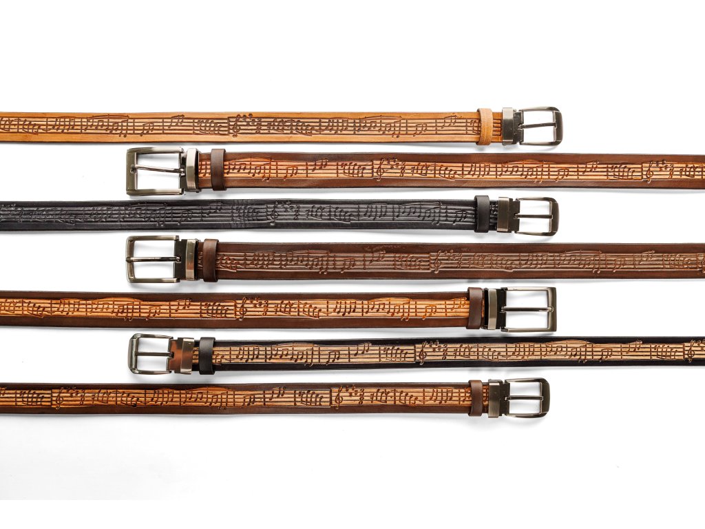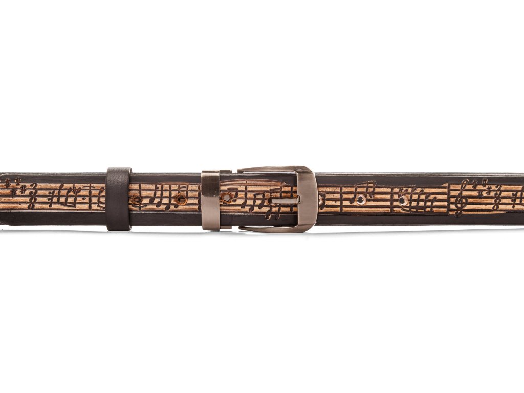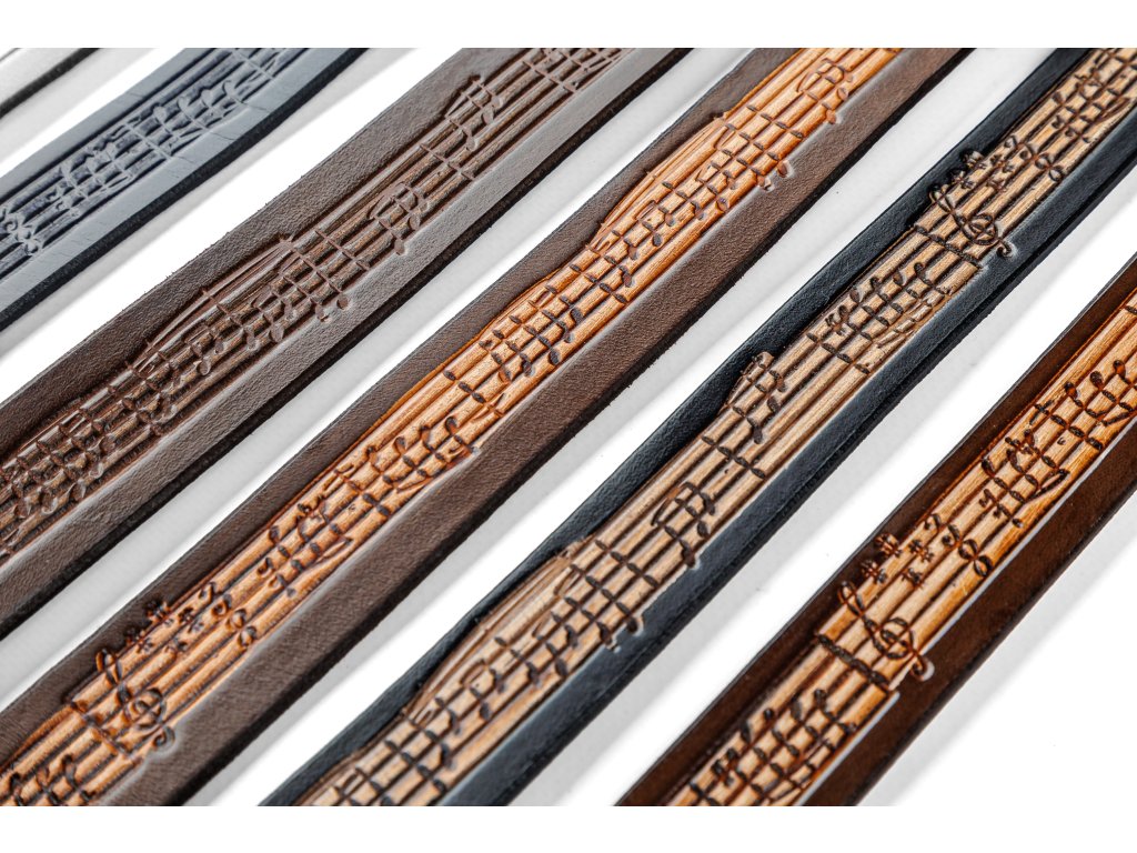 Tento stylový pásek z kvalitní hlazené hovězí kůže je ozdoben reliéfem partitury v přírodní (světle hnědé) barvě, která nádherně kontrastuje s černým podkladem. Přezka je umístěna na pravé straně a šířka pásku je 2,5 cm, což bývá preferovaná varianta zejména pro dámy.