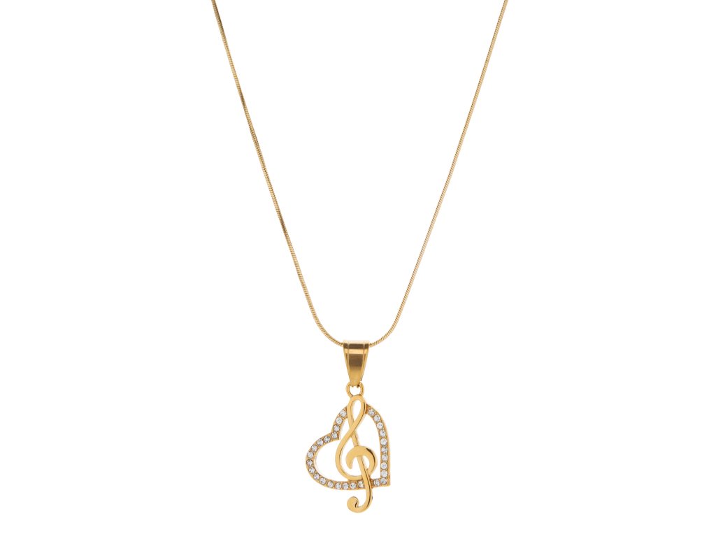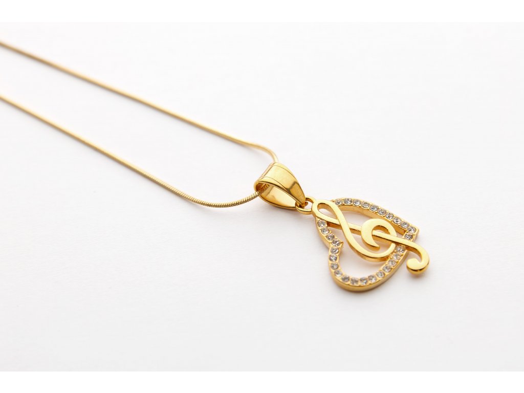 Tento náhrdelník v barvě zlata s přívěskem ve tvaru srdce, v němž je zasazen houslový klíč zdobený třpytivými kamínky, je dokonalým symbolem vášně pro hudbu. Díky svému designu se hodí jak k dennímu nošení, tak k elegantním příležitostem a vždy dodá vašemu outfitu jedinečný nádech originality.
