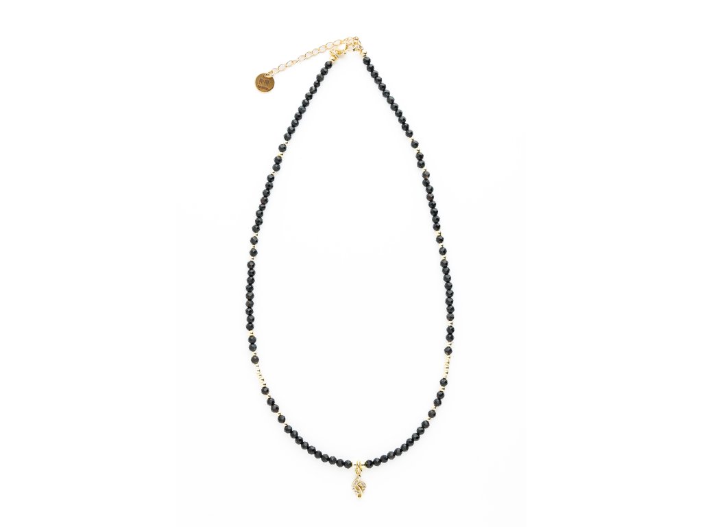 Náramek z přírodních minerálů s přívěskem z bižuterního kovu v barvě zlata zdobeným zirkony.