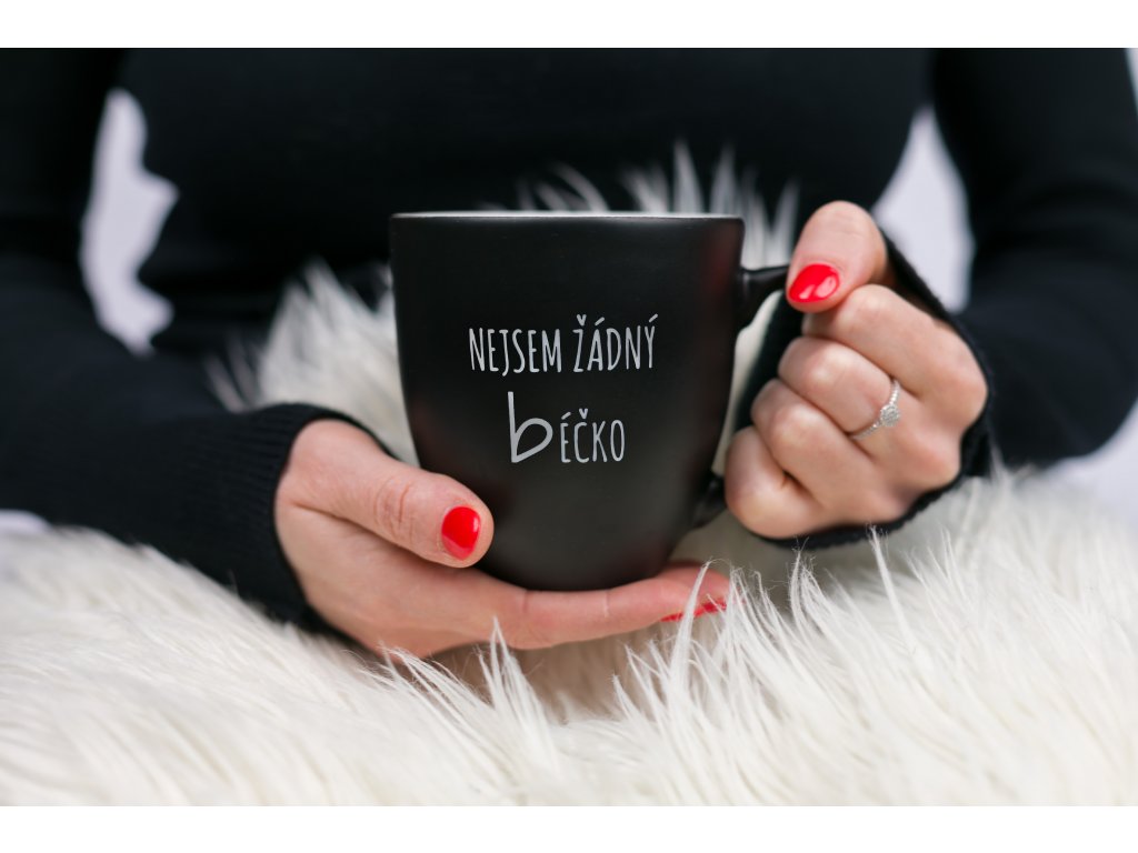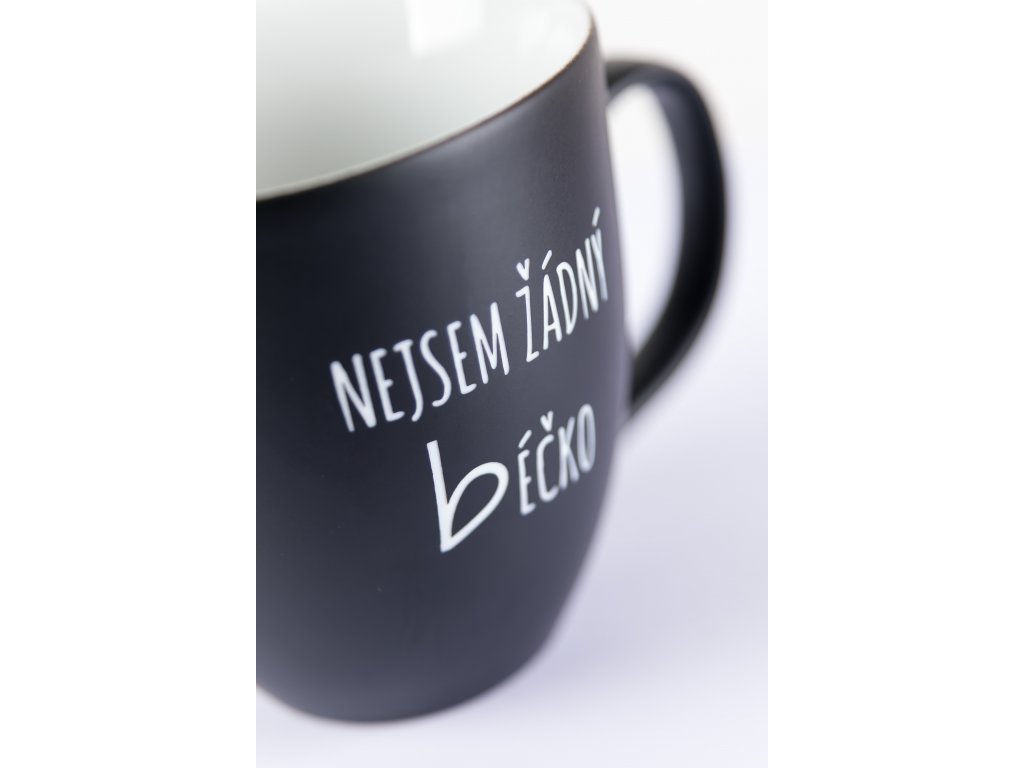 Hrnek má černou, matnou barvu, uvnitř je bílý a je na něm pískovaný, plastický nápis NEJSEM ŽÁDNÝ BÉČKO.