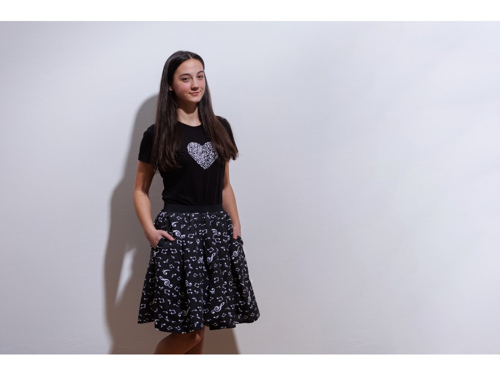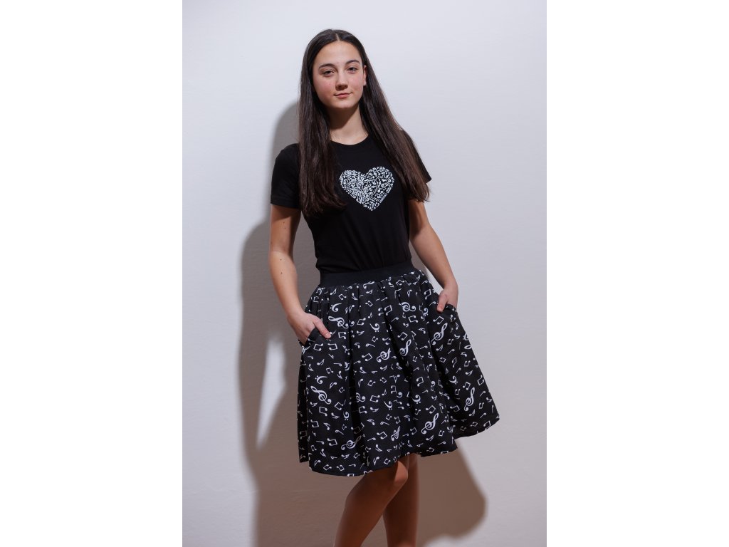 Sukně zdobená hudebními symboly bude vypadat skvěle k elegantnímu i ležérnímu outfitu. Záleží jen na tom, jaké zvolíte doplňky. Co máte raději? Lodičky, nebo tenisky ;-)