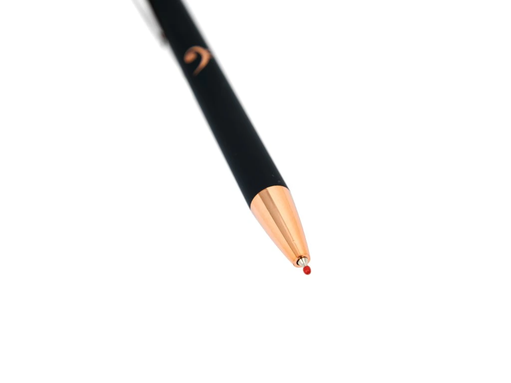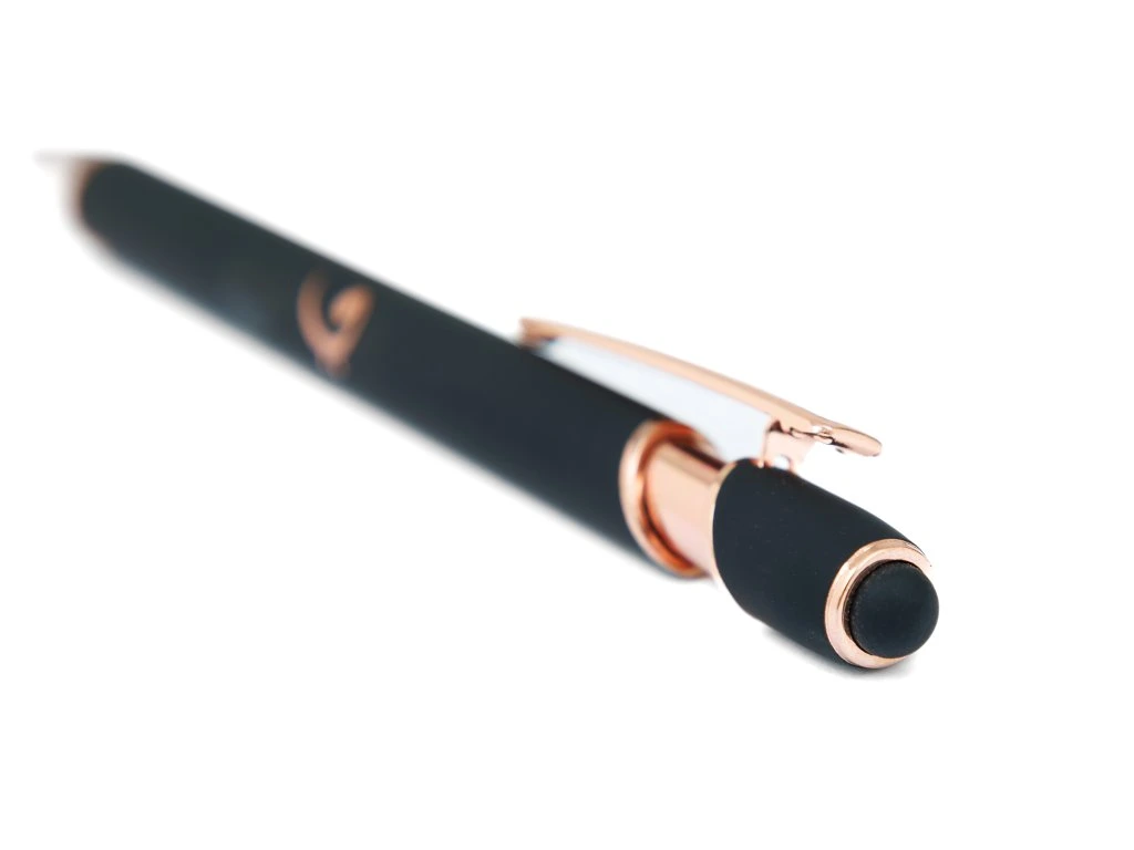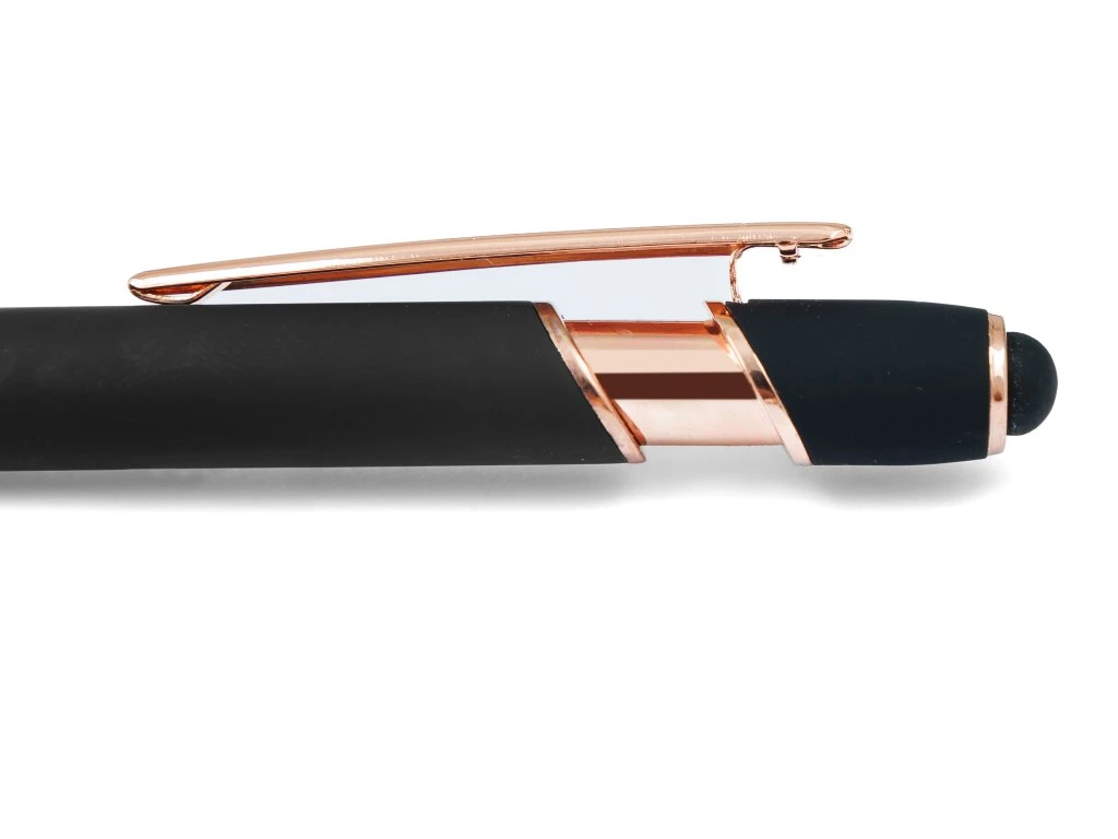 Pero má měkký povrch pro pohodlný úchop, doplňky v barvě růžového zlata a praktický klip pro snadné přenášení. Součástí je také stylus pro snadné ovládání dotykových zařízení. Toto pero je perfektní volbou pro ty, kteří ocení eleganci a kvalitu v každém detailu.