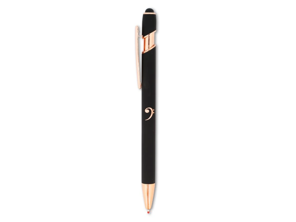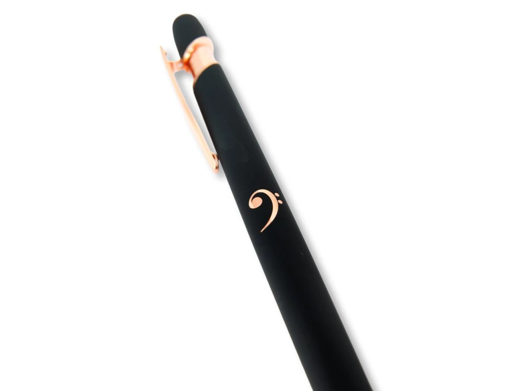 Kovové kuličkové pero s měkkým povrchem pro pohodlný úchop má černou barvu, je ozdobeno doplňky v barvě růžového zlata. Má praktický klip a stylus a hlavním motivem je basový klíč.