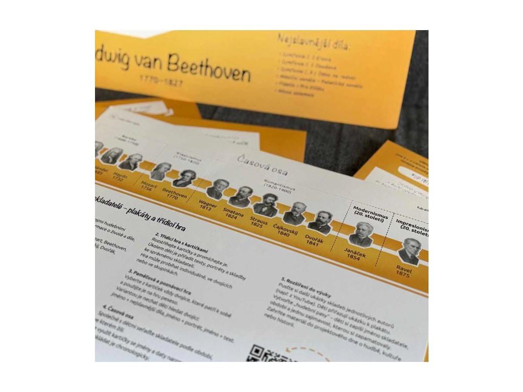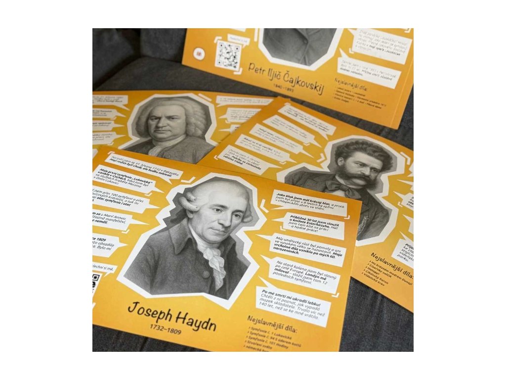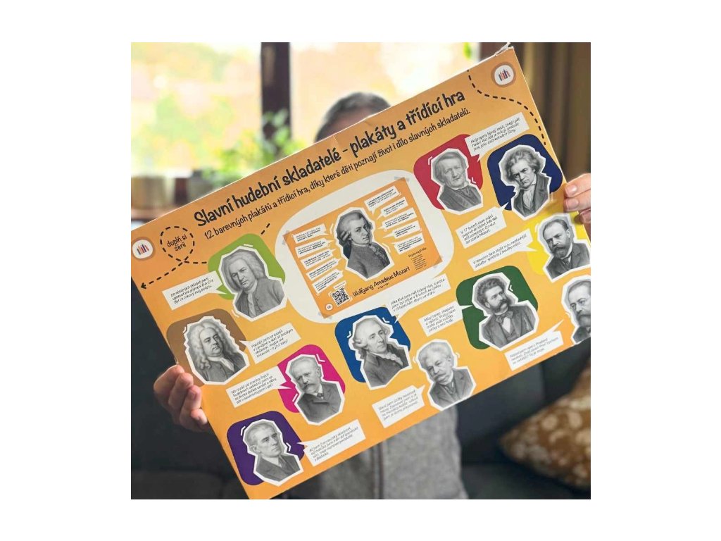 Objevte jedinečnou sadu 12 vzdělávacích plakátů, které zábavnou formou přibližují svět klasické hudby dětem i studentům. Každý plakát obsahuje portrét slavného skladatele, dvanáct komiksových bublin s poutavými fakty o jeho životě a tvorbě, seznam nejznámějších skladeb a také QR kód, díky kterému si lze hudbu okamžitě poslechnout. Tato interaktivní pomůcka propojuje vizuální učení s hudebním zážitkem a přirozeně vede děti k hlubšímu zájmu o hudbu.