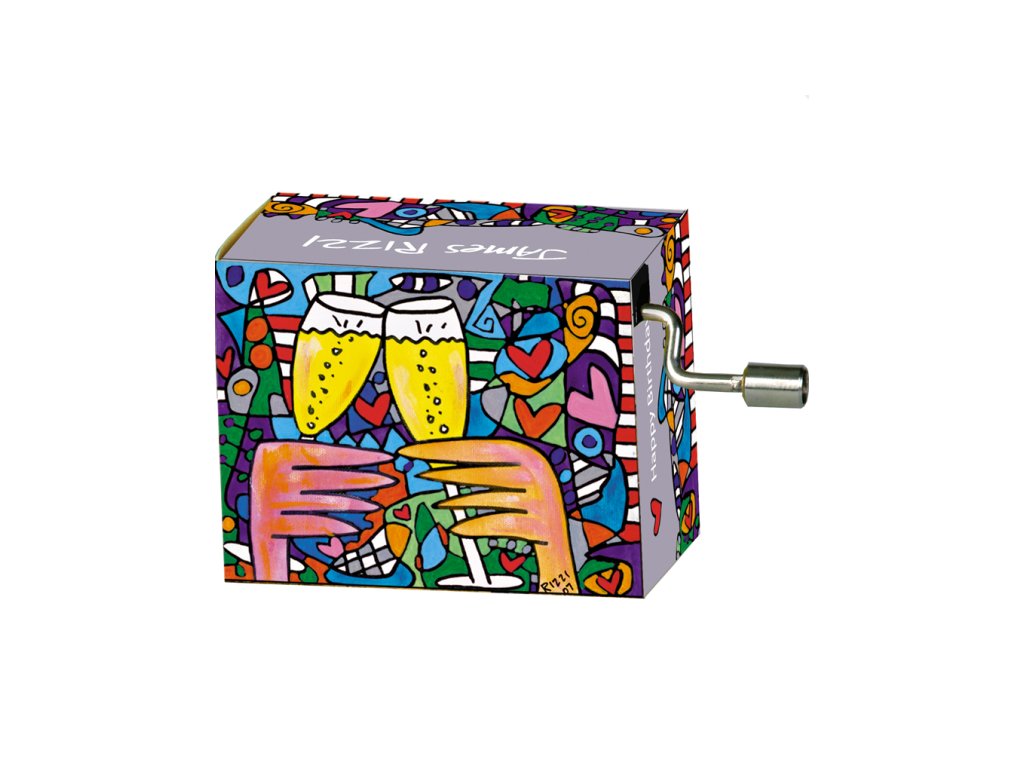 9. Kovový hrací strojek s kličkou, v papírové krabičce, motiv kresby Loving You od amerického pop artového malíře Jamese Rizziho. Hraje část narozeninové písničky Happy Birthday