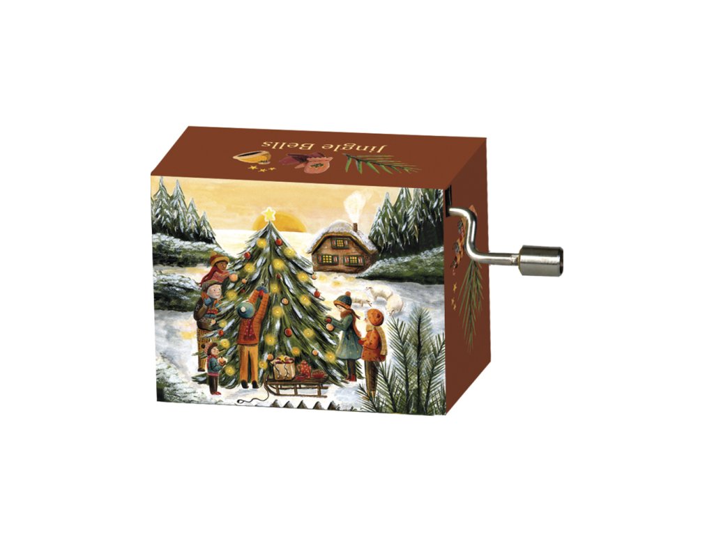 2. Kovový hrací strojek s kličkou, v papírové krabičce s obrázkem vánočních stromků. Hraje část vánoční písně Jingle bells.