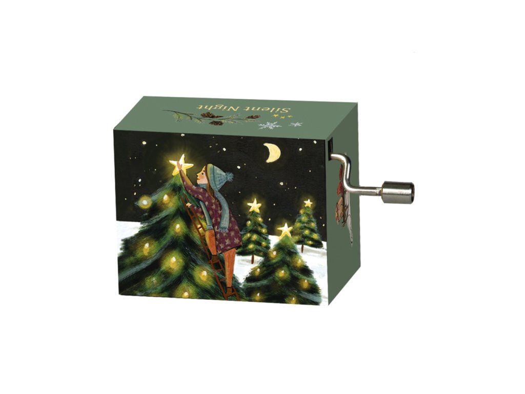 .Hrací skříňka se skladbou „Tichá noc“ je jedinečný hudební dárek, ideální pro všechny milovníky melodií a vánoční atmosféry. Kovový mechanický strojek je vložen v elegantním papírovém obalu s dekorativním motivem – při otáčení kličkou se začne rozehrávat část známé skladby, a vy sami určujete tempo melodie, melodie se rozehraje jen tak dlouho, jak dlouho budete kličkou pohybovat.